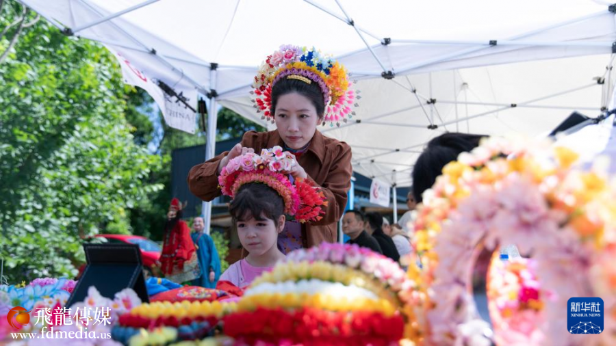 5月24日,在塞尔维亚首都贝尔格莱德,一名女孩体验中国福建蟳埔女习俗“簪花围”。