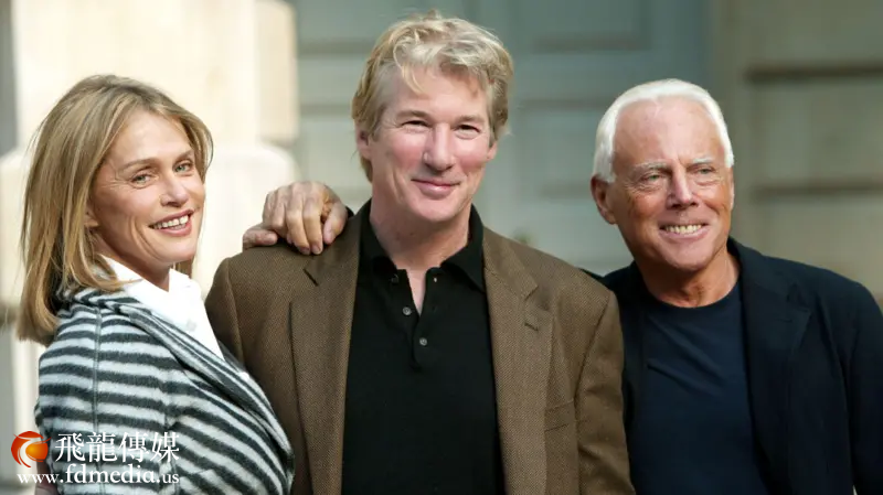 《美國舞男》女主角羅倫·赫頓(左)、男主角理查·基爾(中)與亞曼尼(右)在英國倫敦一場亞曼尼特展會上合影。理查·基爾在該電影中穿著全身的亞曼尼服裝演出。 图片来自:Reuters