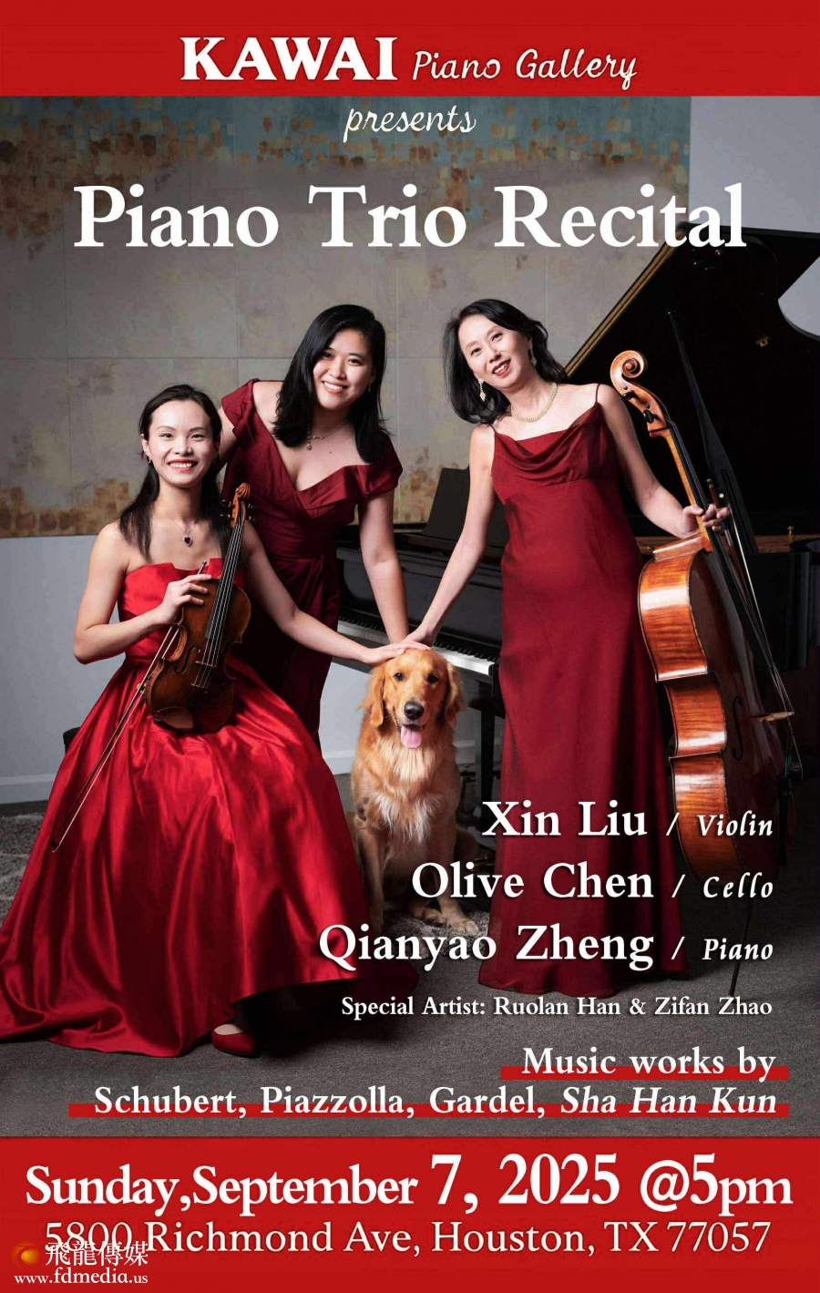 9月7日,一场别开生面的音乐盛会在KAWAI Piano Gallery 隆重举行。休斯顿三位兼具才华与风采的年轻音乐家——小提琴演奏 Xin Liu、大提琴演奏 Olive Chen、钢琴演奏 Qian Yao Zheng,携手献上钢琴三重奏演出。三人以精湛的技艺与深情的演绎,带领观众穿越时空与地域的界限,在旋律与和声的交织中,让灵魂与音乐深度共鸣。