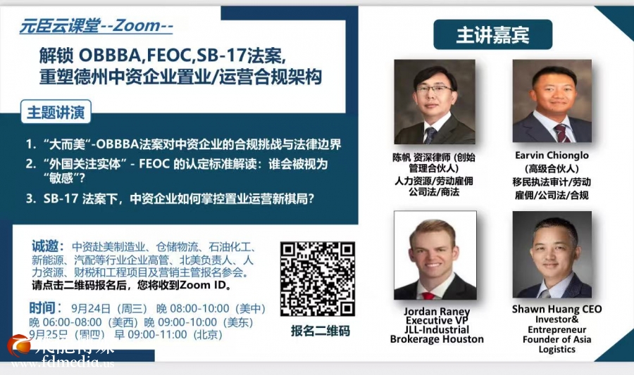 线上讲座: 解锁OBBBA,FEOC,SB-17法案, 重塑德州中资企业置业/运营合规架构。