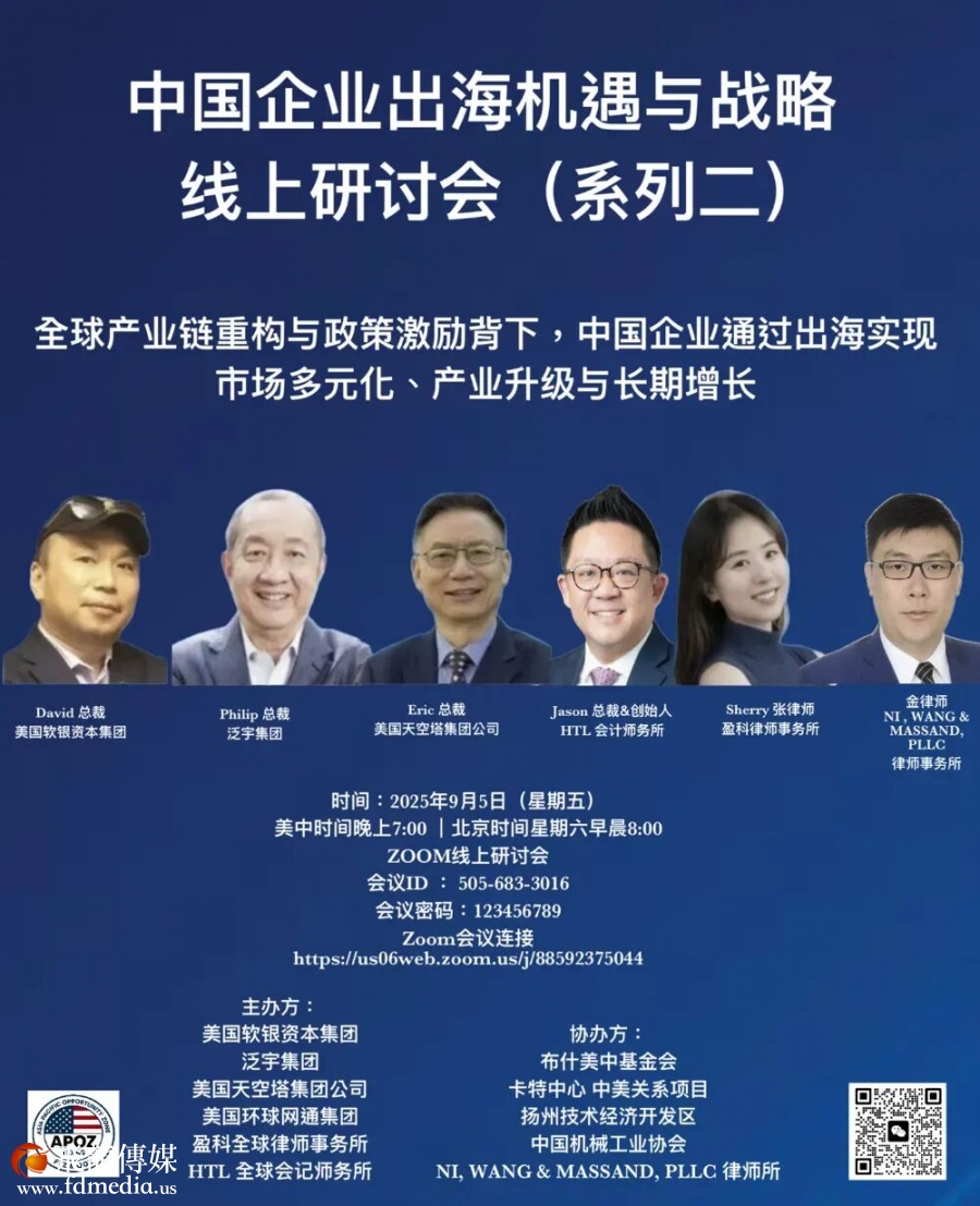 由美国软银资本集团、APOZ 亚太免税园区、HTL 会计师事务所、盈科律师事务所、NI, WANG & MASSAND, PLLC 律师事务所、泛宇集团、美国天空塔集团公司、美国环球网通集团、乔治·H·W·布什美中关系基金会、卡特中心中美关系项目等联合主办的 “中国企业出海机遇与战略” 线上研讨会,于美国中部时间 2025 年 9 月 5 日晚 7点成功举办。