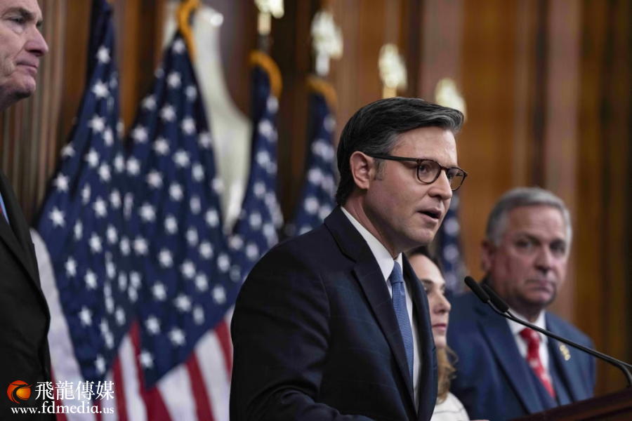 众议院议长迈克·约翰逊主持新闻发布会。图片来源:Andrew Thomas/Zuma Press