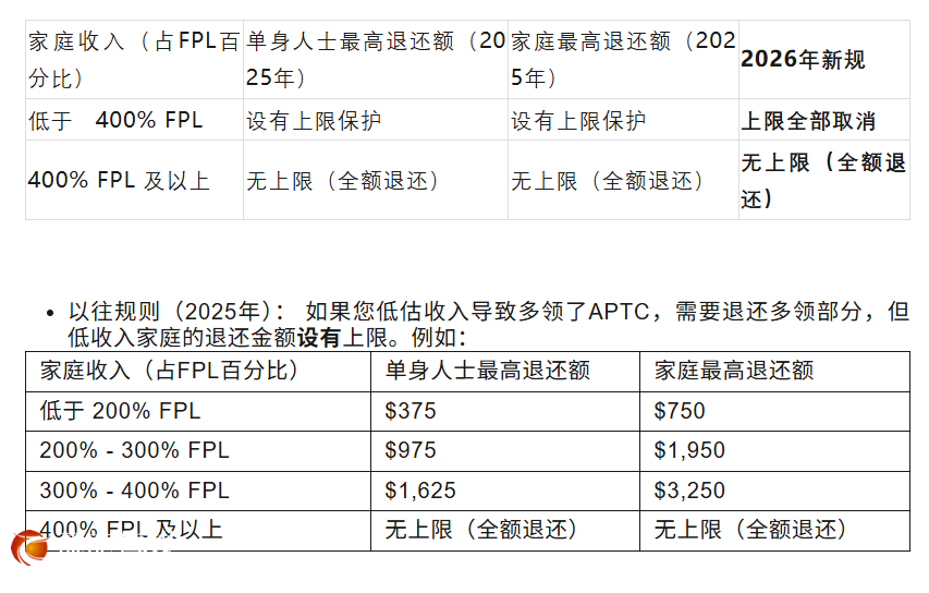 这是2026年最关键的财务风险变化之一:如果您低估收入导致多领了APTC,年终报税时将需要一分不少地补交全额多领的APTC,没有任何上限保护!