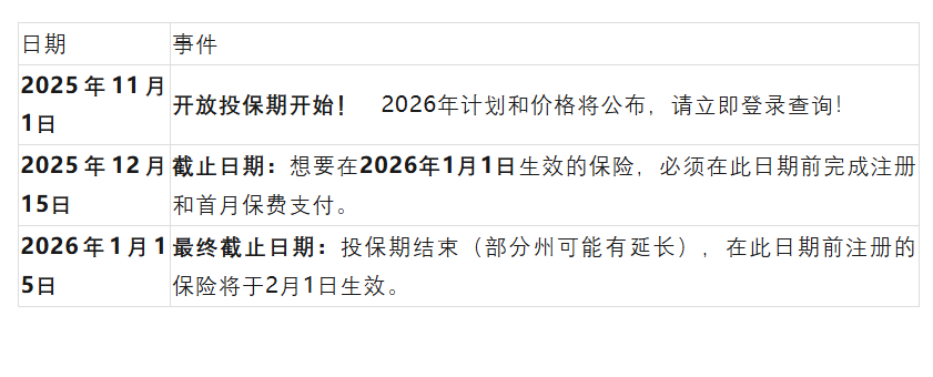 2026年ACA健保开放投保期(Open Enrollment Period)即将开始。请标记以下重要日期: