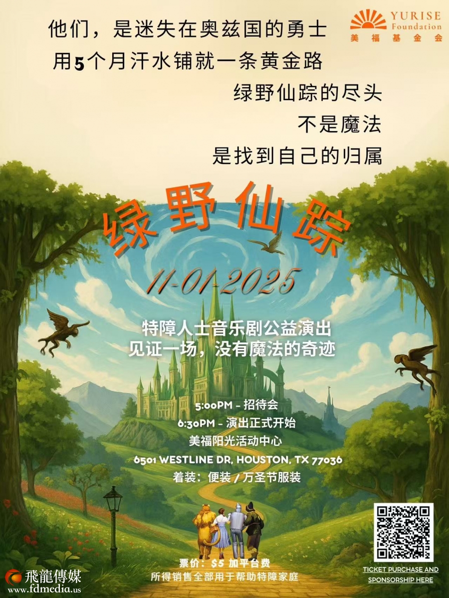 表演者:YURISE(美福基金会)特殊需求家庭合唱团; 时间:2025年11月1日(星期六)下午5:00地点:美福阳光活动中心,6501 Westline Drive, Houston, TX 77036