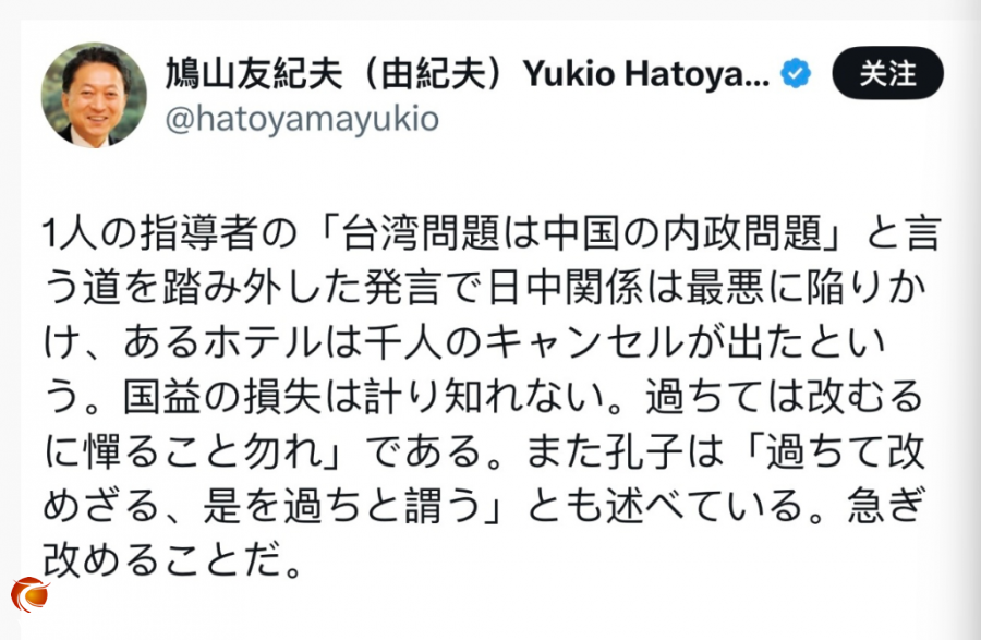 就近期日本首相高市早苗涉台错误言论,日本前首相鸠山由纪夫当地时间20日再次发文:“因为一名领导人发表了偏离‘台湾问题是中国内政’这一正道的言论,日中关系几乎陷入最恶劣的境地,据说有一家酒店出现一千人取消预订的情况。国家利益的损失无法估量。”