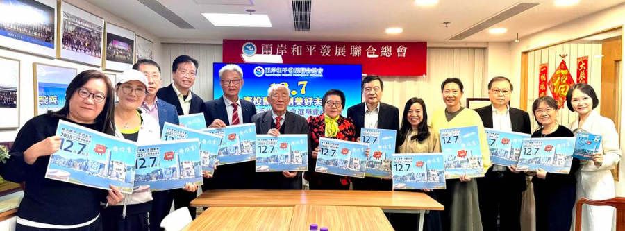 兩岸和平發展聯合總舉辦動員大會 首席會長林廣兆,會長陳趙滿菊,理事長沈墨同,陳建輝主席等出席,並齊齊呼籲「1207齊投票 共創美好未來 」合影