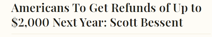贝森特表示,美国工薪阶层将在2026年第一季度收到退税。
