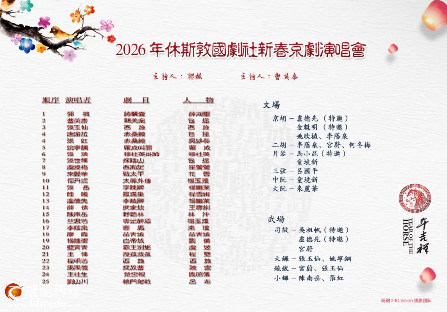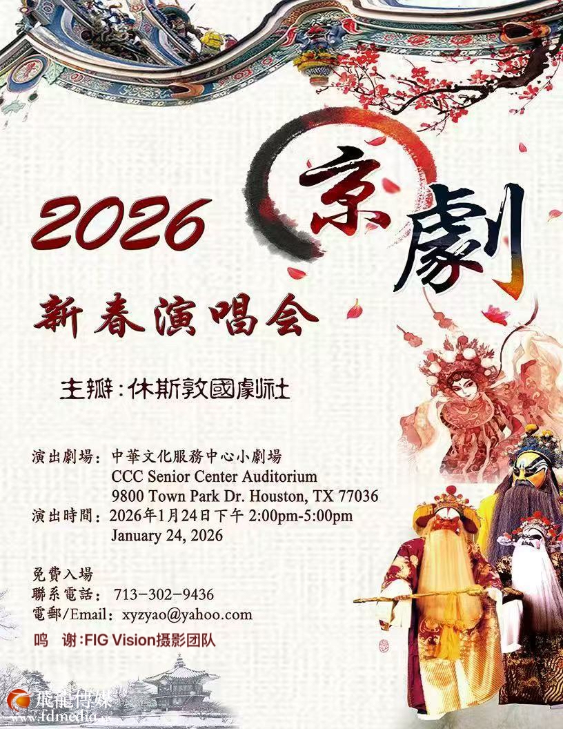 休斯敦國劇社將於2026年1月24日星期六下午2時在休斯敦中华文化服务(CCC)小礼堂舉办2026年新春京劇演唱會。今年的演唱會联合奥斯汀国剧社、新泽西国剧社以及北美其他剧社的戏友和老师加盟。行當齊全,流派紛呈,展示票友和戏迷们多年演练的深厚底蘊,中青年为主的团队閃亮登場,以青春的活力演繹古老的藝術形式。演唱會文武場面阵容强大,特邀新泽西国剧社琴师卢德先、金魁明老师,以及来自波士顿的鼓师吴祖帆老师助阵。屆時各位愛好京劇國粹的朋友和僑胞們將一飽耳福。