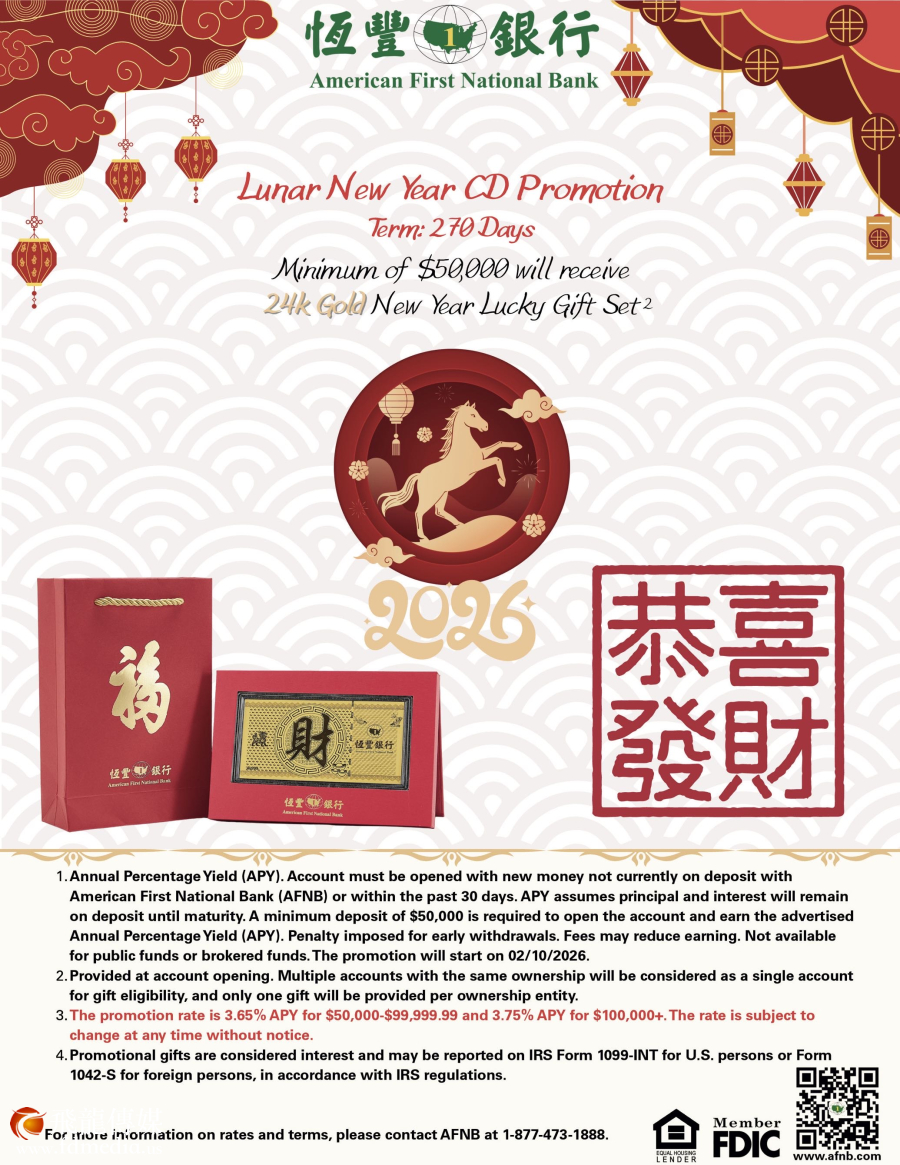 為感謝廣大客戶長期以來的支持,恒豐銀行(American First National Bank, AFNB)在馬年來臨之際,特別定製純金打造的馬年紀念金牌,推出 2026 年限時存款促銷活動。凡符合條件的客戶,即可獲贈純金紀念品一份。