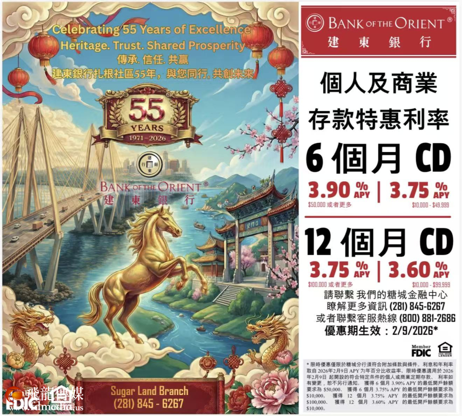 限時優惠僅限於糖城分行須符合附加條款與條件。利息和年利率取自2026年2月9日APY为年百分比收益率。限時優惠適用於2026年2月9日 起開設的符合特定条件的個人或商業定期存款、利率如有變更,恕不另行通知。