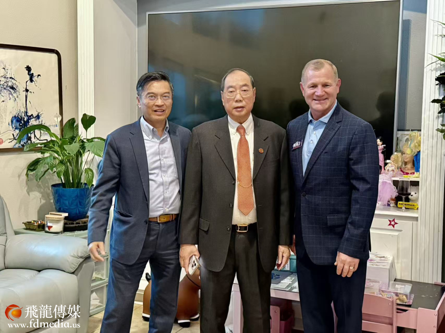 左起:德州福遍郡郡长候选人黄安祥博士(Dr. Daniel Wong)、中国人活动中心董事长陈灼刚先生、国会议员Mr. Trever Nehls合影。