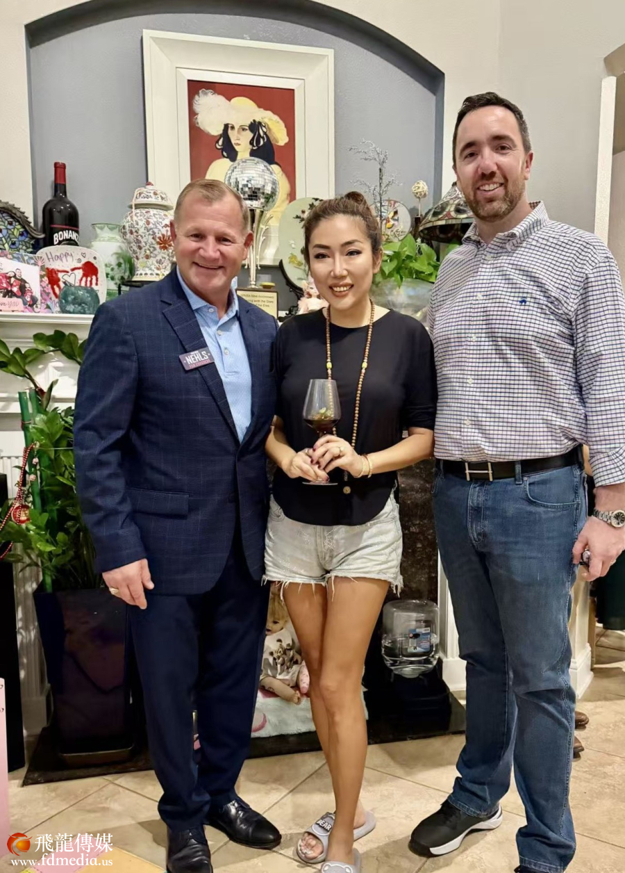 (图右)国会议员 Mr. Trever Nehls与 Fulshear市议员Mr. Patrick Powers 及夫人 Ms. Victoria Powers合影。