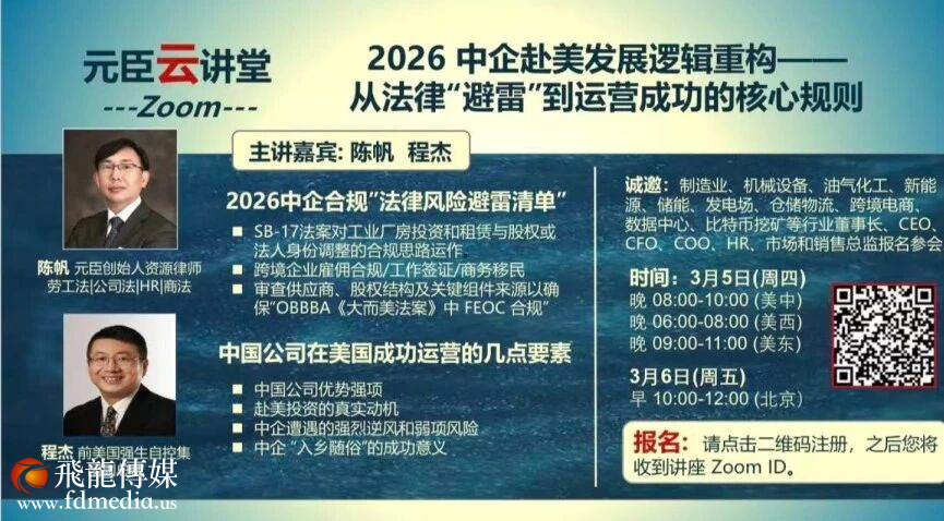 越来越多企业发现:今天赴美的最大风险,早已不是“能不能进来”,而是进来之后,能不能活下去。正是在这一背景下,元臣云讲堂,将于3月5日举办《2026中企赴美发展之法律“避雷”到运营成功》专题Zoom线上讲座。将为正在美国布局或计划进入美国市场的中国企业,提供一次系统性、前瞻性、可落地的风险拆解与战略指引。这不仅是一场法律讲座,更是一场企业生存逻辑的重塑对话。
