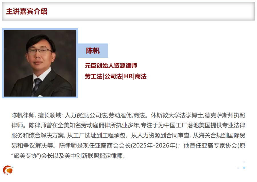 本次讲座中,陈律师将针对在当前监管环境快速变化的背景下,分享对 SB-17 法案实施逻辑 及 OBBBA《大而美法案》下 FEOC 合规要求,包括深入研究并累计一线实务经验,将复杂政策转化为企业可执行的合规路径,帮助企业在合法框架内实现风险隔离与业务连续。强调元臣律所的服务理念始终坚持:合规不是成本,而是企业在美国长期生存的基础设施。