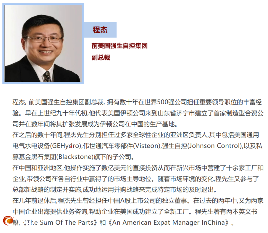程杰,前美国强生自控集团副总裁;美国企业执行管理专家(深谙美国企业文化与本土运营机制)。程总长期在美国多家跨国企业担任亚太地区总裁职务,拥有丰富的一线管理经验,对中企落地美国的管理模式、本土化转型与商业文化具有深刻理解。其职业经历横跨企业战略执行、团队管理与跨文化协同,是少数熟悉“美国运营逻辑”与“跨国企业落地挑战”的实务型管理者。