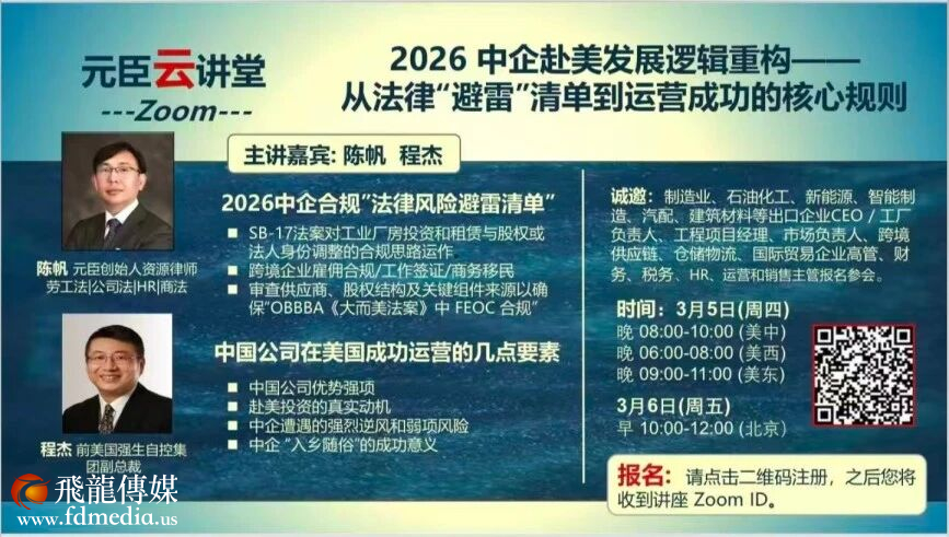 元臣云讲堂将于3月5日晚8点(美中时间)举办《2026 中企赴美发展逻辑重构,从法律“避雷”到运营成功的核心规则》专题Zoom线上讲座。这是“元臣云讲堂“为中企高管量身定制的风险预判与战略更新讲座,错过窗口期,代价可能不只是一次参会机会,唯有提前布局者,方能稳健前行!