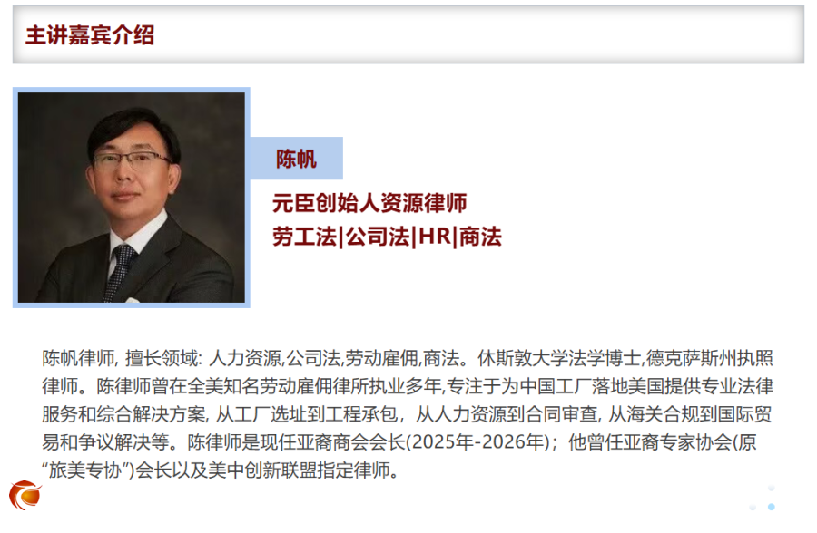 陈帆:元臣国际律师事务所创始人、资深企业运营合规律师(专精 SB-17 与 OBBBA《大而美法案》)。长期深耕德州企业准入、劳工雇佣、公司架构重组与争议解决,深度研究美国SB-17 与 OBBBA《大而美法案》及联邦政策变动对中企的实质影响,将以法律边界与合规路径为主线,系统解析2026年最新风险‘避雷清单”。