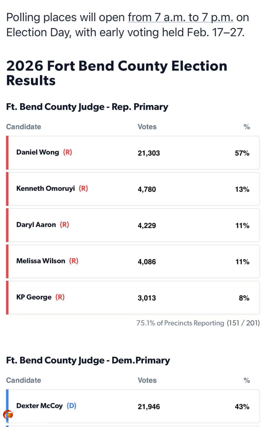 3月3日,正值华人传统佳节元宵节,在大家团圆欢庆之际,Fort Bend 郡长初选结果正式出炉。华裔候选人黄安祥博士(Dr. Daniel Wong)以 57% 的得票率 赢得福遍郡郡长党内初选,成功获得代表共和党参选该职位的资格,为华人社区带来振奋人心的好消息。