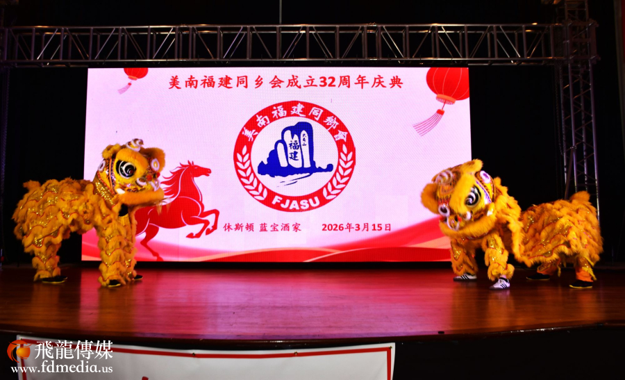 《龙腾富贵开鸿运,狮舞吉祥庆新年》。3月15日,伴随着休斯顿少林寺文化中心醒狮团铿锵有力的锣鼓声,龙腾狮跃、喜气洋洋,美南福建同乡会在Lam Bo宴会厅隆重举办2026年会,并举行新老会长交接典礼。