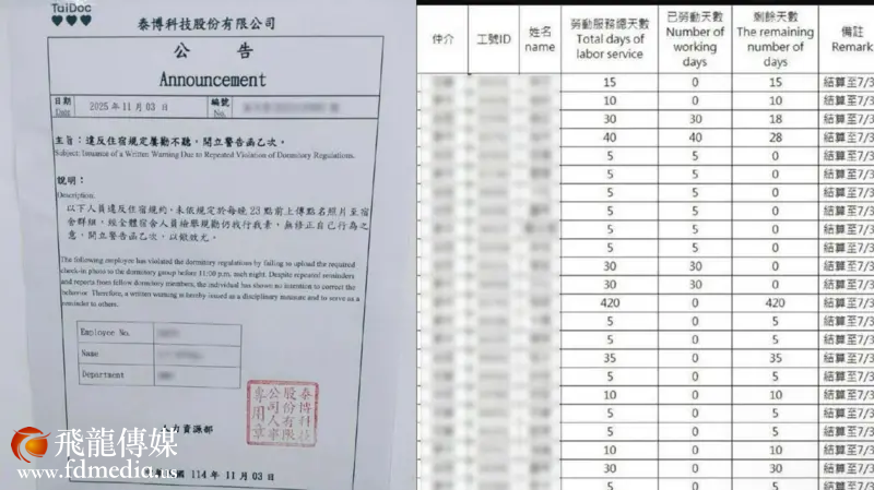 有资深员工指这些规定在近年加严,一份由工会干部在会议中取得、标注“2024年12月修订”的公司《外籍同仁人事管理规章》更明文规范,“男女感情纠纷者”将被处以一个月劳动服务,累犯者则遣返回国;在受雇期间结婚、怀孕者,将受罚或被遣返,员工还须向公司坦诚提供在台亲友的姓名、手机与住址,违者同样要受罚。