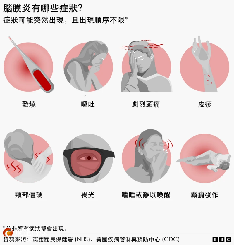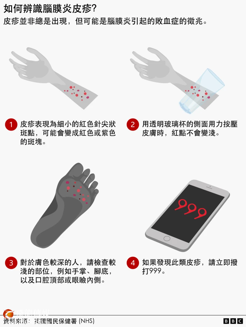 任何出现脑膜炎或败血症症状的人,应立即前往最近的急症室求医,或致电999。
