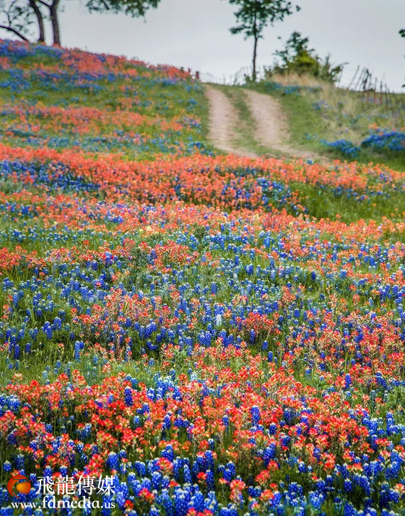 - 🌄 蓝帽花铺满丘陵,搭配红色Indian Paintbrush(火焰花)超级震撼