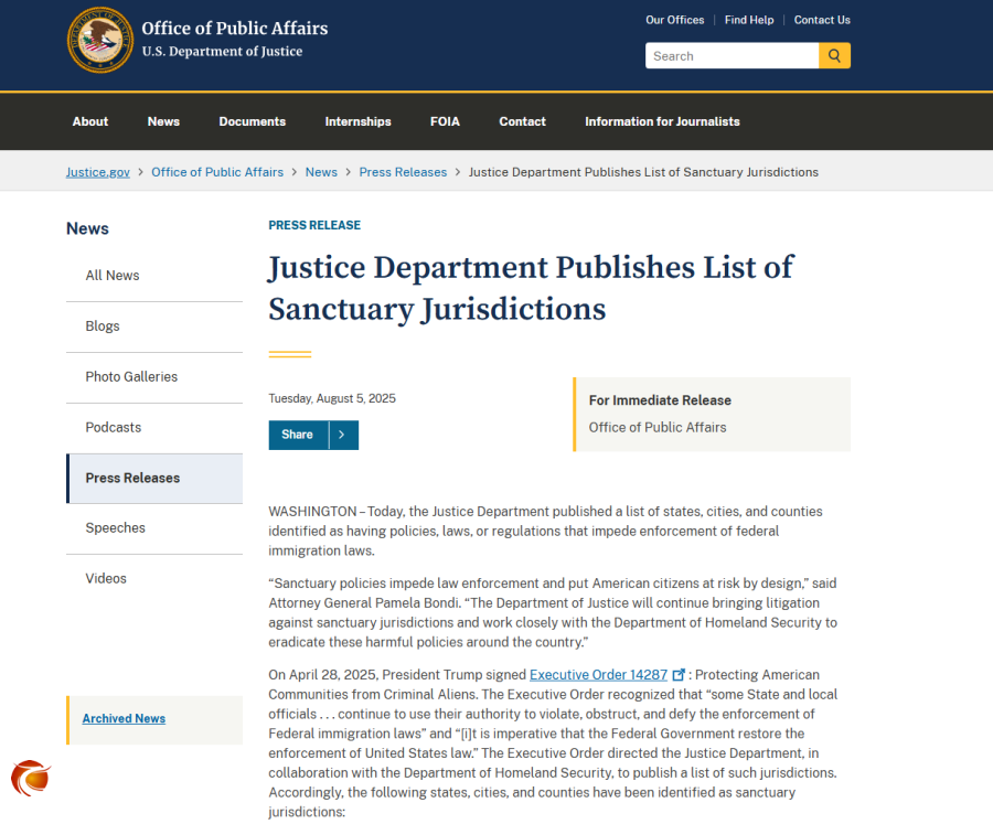 根据美国政府数据,截至2025年8月,全美共有12个州、18个城市、4个县以及华盛顿特区被认定为庇护辖区。