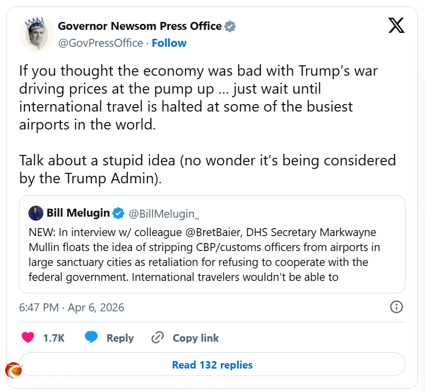 加州州长加文·纽森(Gavin Newsom)在社交平台上批评该提议“愚蠢”,并警告称,若限制国际入境服务,可能导致全球最繁忙的一些机场航班受阻。
