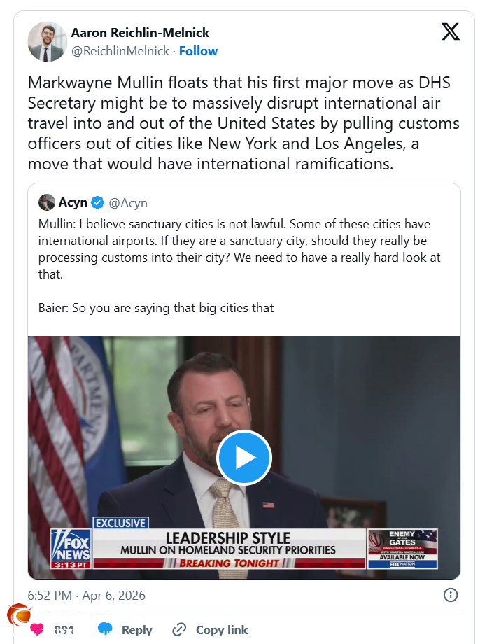据independent 4月7日报道 美国国土安全部长穆林(Markwayne Mullin)近日表示,政府正考虑对部分“庇护城市”采取更强硬措施,包括可能取消其国际机场的海关与移民入境服务,此举迅速引发政界及专家广泛关注。