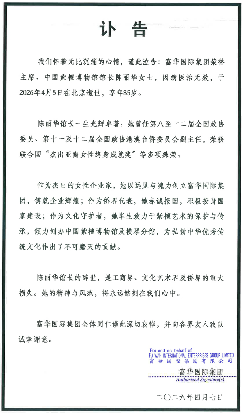 2026年4月7日,富华国际集团发布讣告称,富华国际集团荣誉主席、中国紫檀博物馆馆长陈丽华女士,因病医治无效,于4月5日在北京逝世,享年85岁。