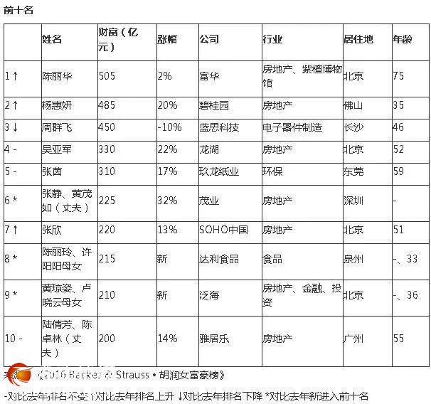 陈丽华是早年福布斯中国富豪榜上最知名、长期唯一稳定上榜的中国女富豪。2001年福布斯中国内地100富豪榜上,陈丽华以55亿元的财富排名第6位,成为中国内地女首富。2012福布斯中国富豪榜以176.4亿元的财富排名第17位。2014福布斯中国400富豪榜上,陈丽华以373亿元的身家成为全球白手起家女富豪榜第一名。2018年的胡润女企业家榜,陈丽华以505亿元位居第三。