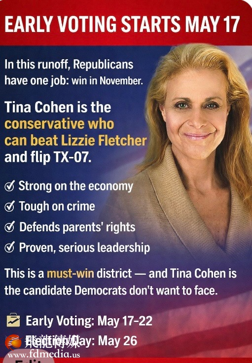 Tina Cohen蒂娜·布鲁姆·科恩(共和党)正在竞选美国众议院议员,代表德克萨斯州第7国会选区。她将在2026年5月26日的共和党初选决选中参选。她于2026年3月3日通过共和党初选晋级。