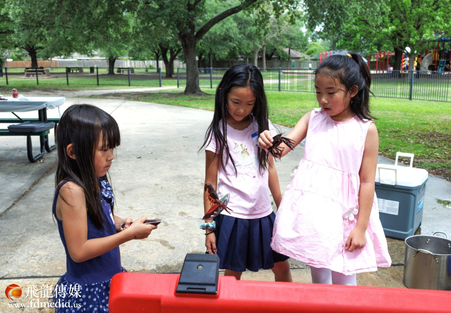 小朋友快乐的与小龙虾”互动“。