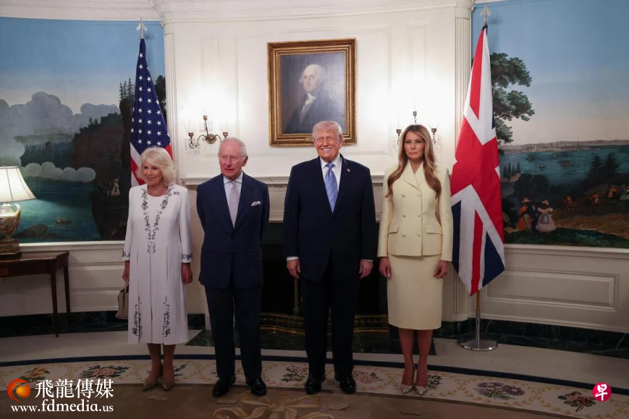 4月27日,美国总统特朗普、第一夫人梅拉尼娅、英国国王查尔斯三世和王后卡米拉在白宫合影。 (路透社)