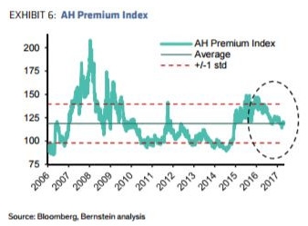 过去几年中,在A股市场和香港市场两地同时挂牌上市的同一家公司的股票长期存在较大价差,尽管许多投资者想要进行套利交易,但是这个价差却长期没有收敛。追踪两地同时挂牌的A/H股票溢价的指数很少跌落至100点,大部分时间中,A股市场挂牌的股票都相对H股享受较高的估值。
