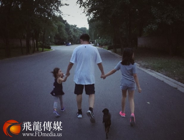 在落日余晖,微风吹拂的傍晚,一家人在茶余饭后带上自家的小狗,一起散步,多么平凡而幸福的生活。