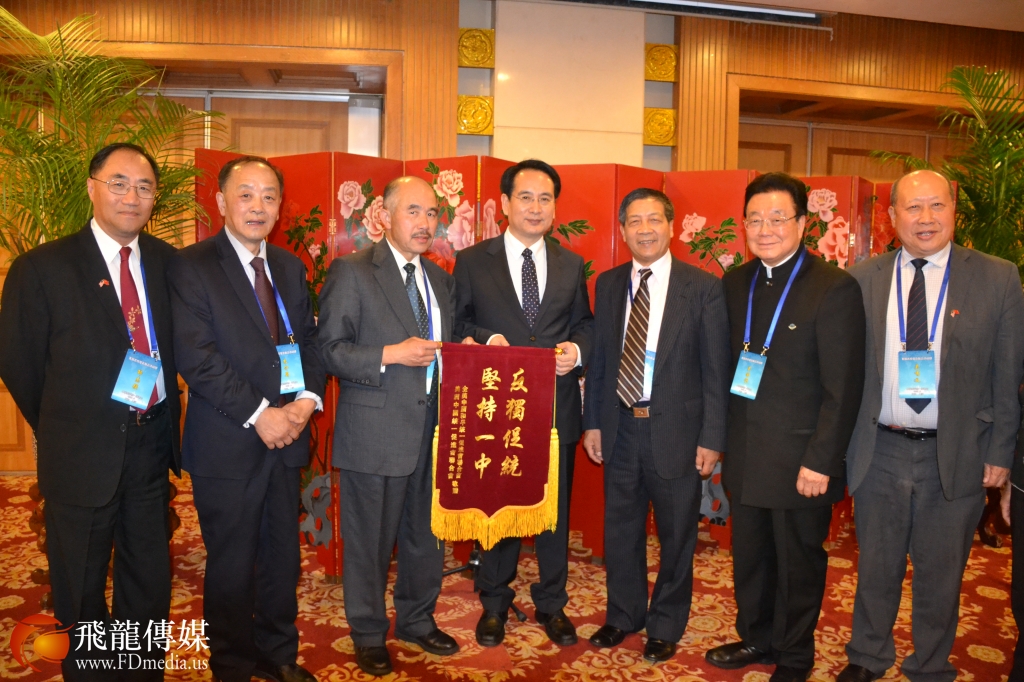 访问团赠送锦旗给中国国侨办,并合影留念。(左起:北加州和统会会长邹志强、访问团副团长 朱介眉、团长陈国庆、中国国侨办副主任谭天星、副团长吴惠秋、访问团顾问 吴国宝、美西和统会会长吴有义)
