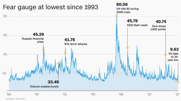 瑞银集团运营部负责人Cashin认为,目前这种超低波动率的市场环境非常不正常。在过去很长一段时间内,美股市场单日波幅都没有超过1%。尽管近期也爆发出一些地缘政治冲突的消息,但是大部分投资者似乎对这些风险因子不为所动,这让人有些不可思议,因为许多人看上去都忽视了这些可能出现的市场风险事件。