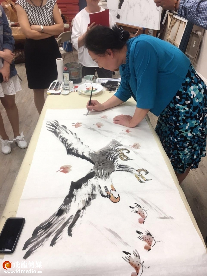 当晚,恒懿老师画了一幅雄鹰图赠送给休斯顿古董拍卖公司董事长吴因潮(右二)。张要武老师(左一)、记者铁梅一起合影。