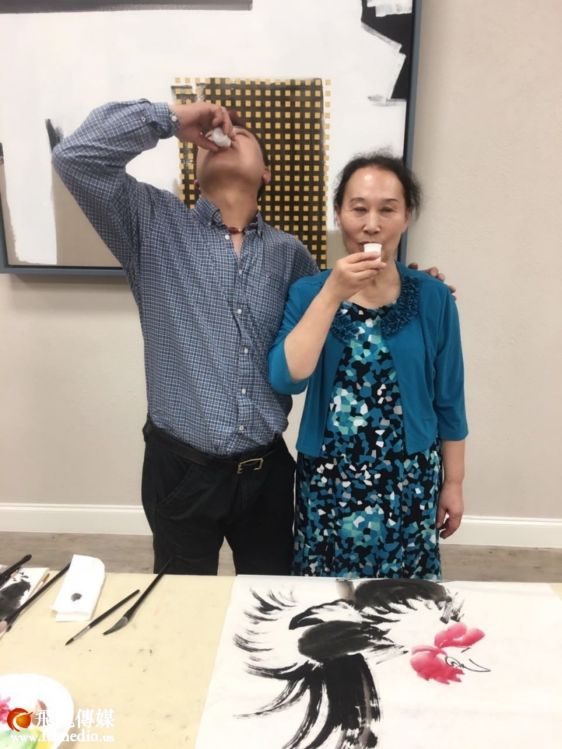 恒懿老师与张要武老师一起喝酒共同作画,场面盛是神采翩翩,潇洒自然。