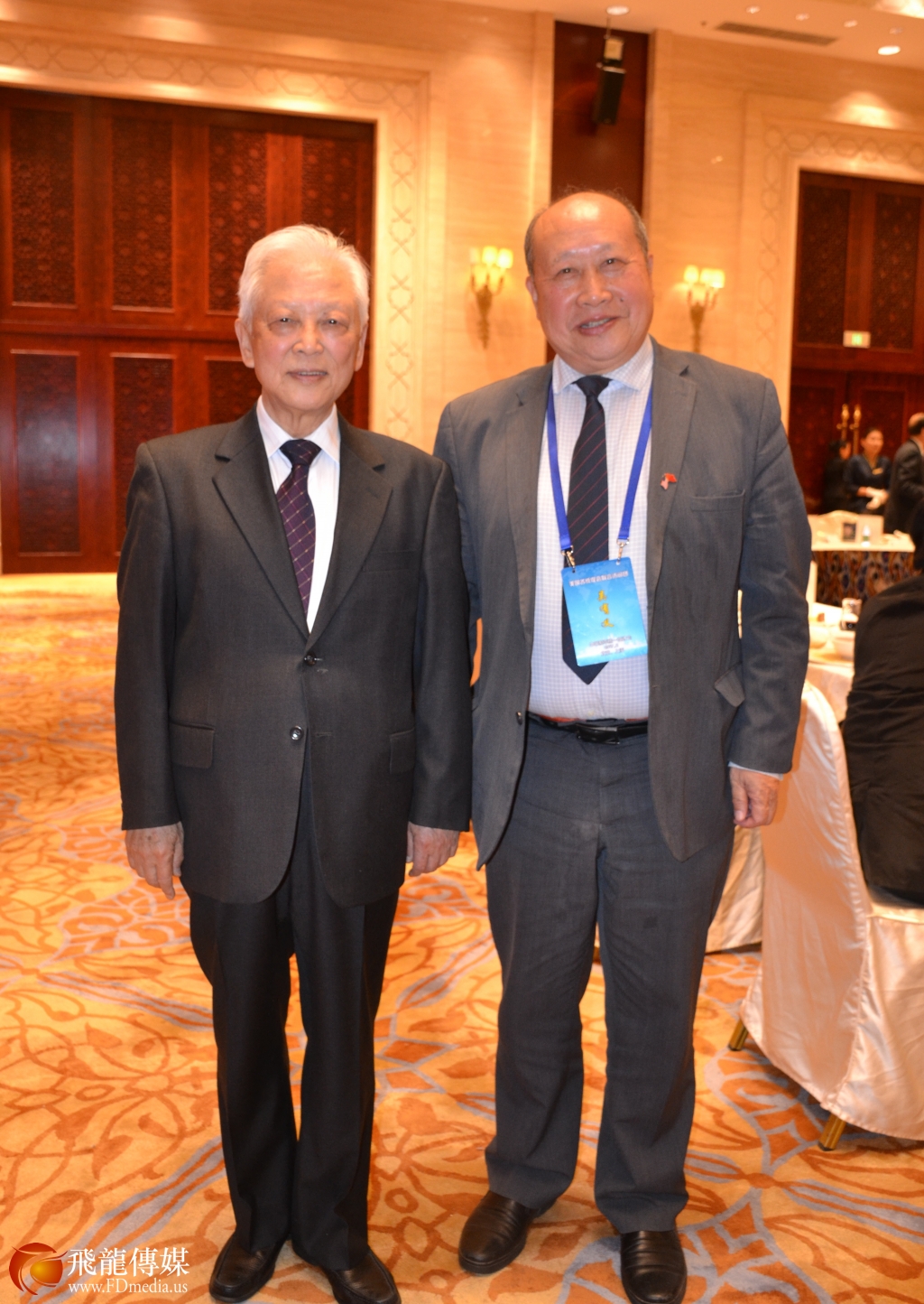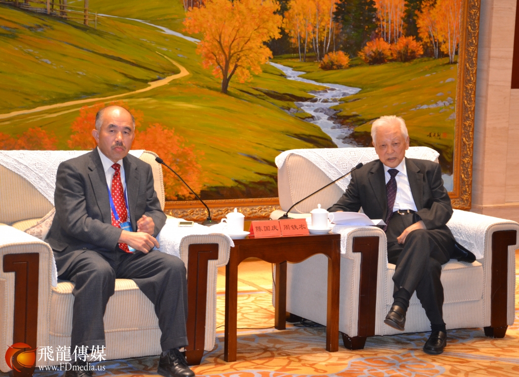 图左:访问团团长陈国庆,图右:中国和平统一促进会名誉会长周铁农 。