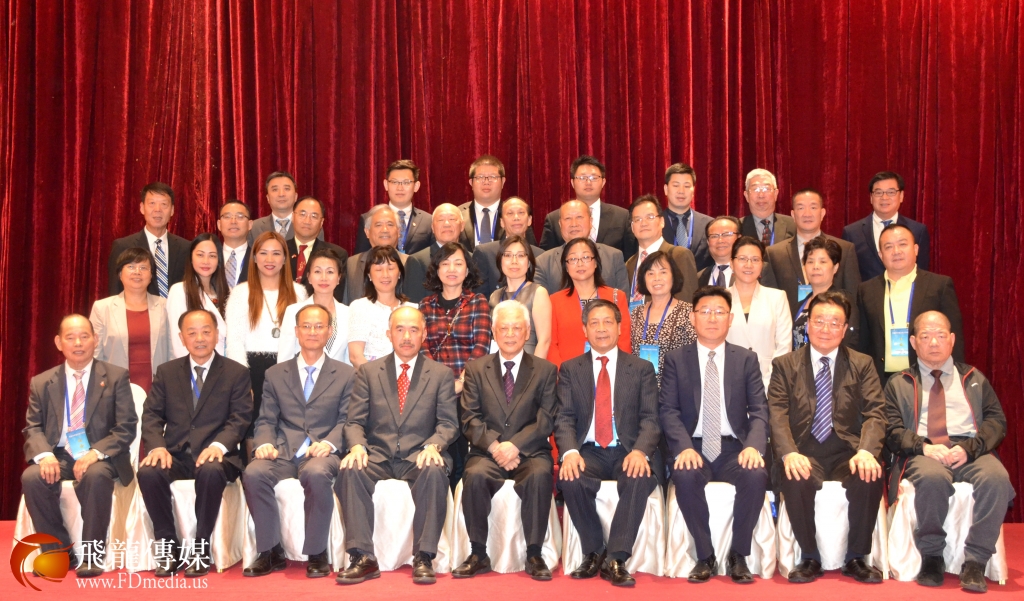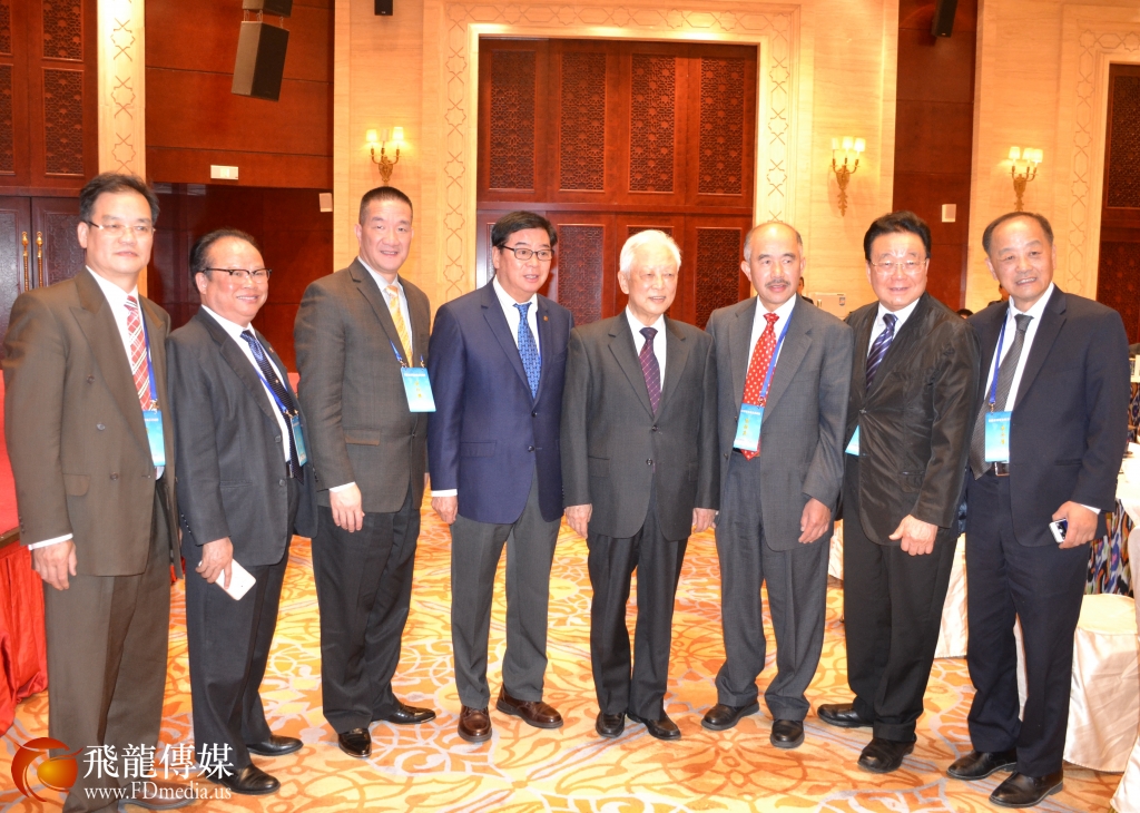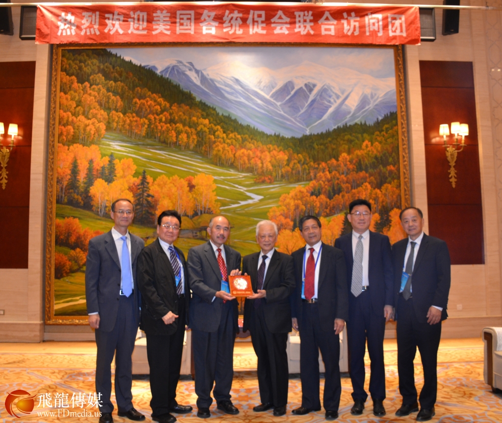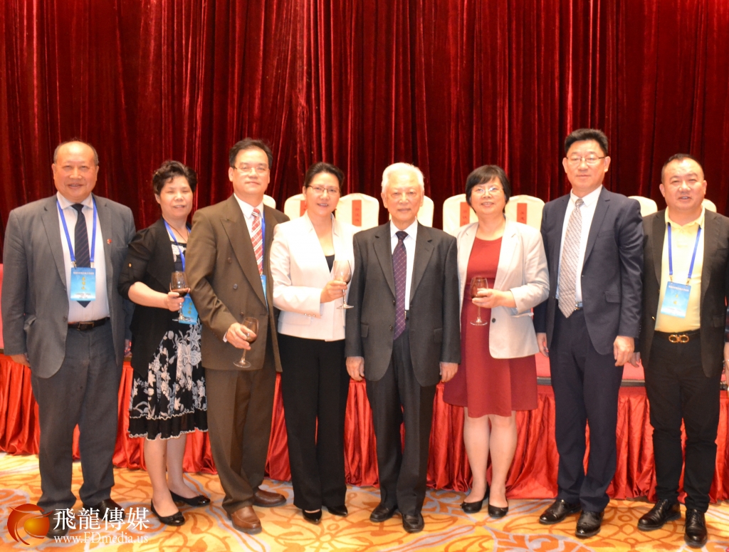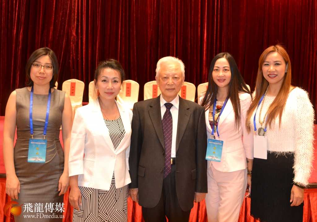 来自德州的代表与中国和平统一促进会名誉会长周铁农合影留念。图左起:德州美中促进会副会长陈文、德州统促会副会长陈韵梅、周铁农荣誉会长、德州美中促进会副会长黄琛、德州统促会常务副会长陈铁梅