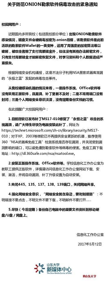 较早遭受病毒攻击的山东大学信息化工作办公室5月12日晚发布的预警信息与太原理工大学类似,并提供了正版软件供教职工下载、安装。该校工作人员告诉澎湃新闻,“也建议更新系统,目前还没有windows 10系统的电脑中这个病毒的。”