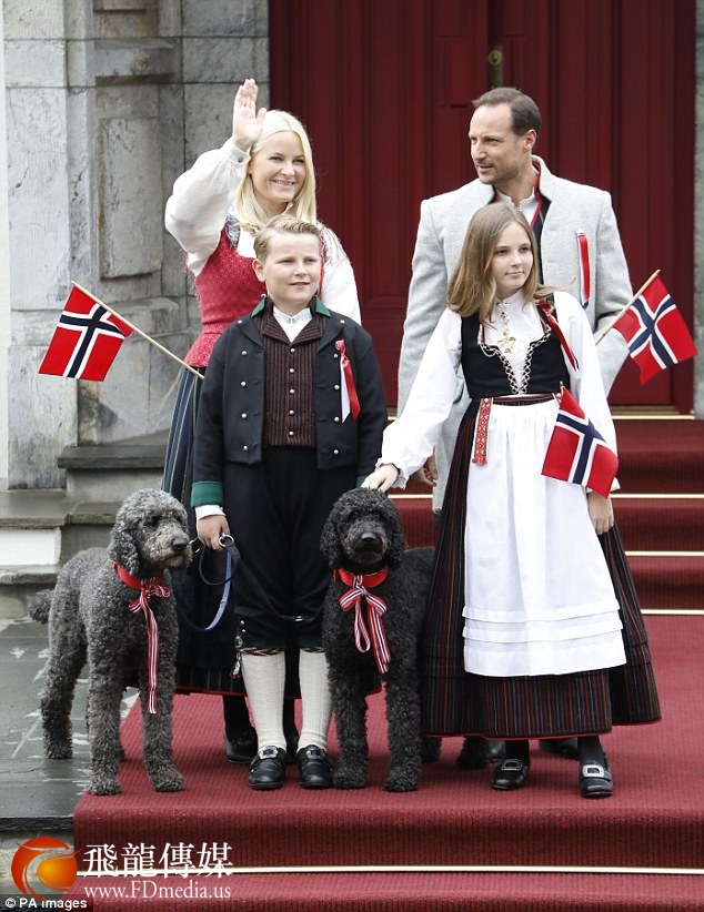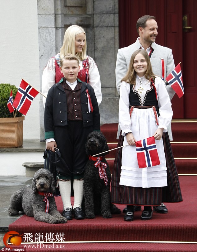 5月17日,挪威王室成员身着传统服饰庆祝国庆日,王储哈康·马格努斯王子,梅特·玛丽特王妃以及他们的女儿英格丽德·亚利桑德拉公主,儿子斯维尔·马格努斯王子一同参加。到处洋溢着节日的氛围,甚至王子的爱犬也带着用挪威国旗装饰的项圈。