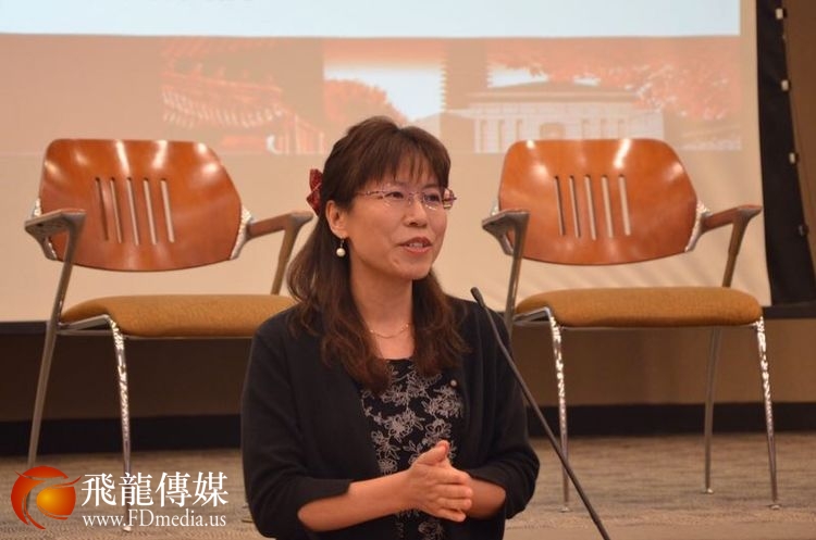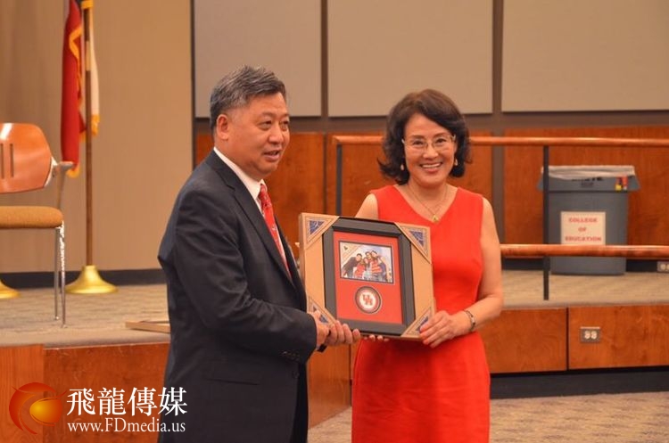 休斯敦大学亚美中心主任邹雅丽教授向李强民总领事赠送纪念品。