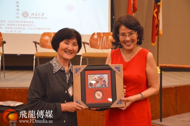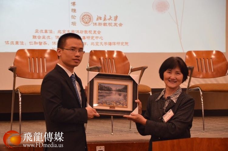 北京大学校友(总)会王丽梅常务副会长向休斯敦校友会赠送纪念品。