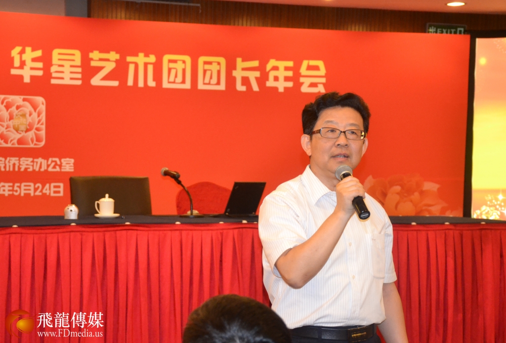 侨办宣传司司长许玉明 在听完所有团长汇报工作后做总结讲话, 赞誉华星艺术团为传承和宣传中国文化所作出的贡献。许司长还表示,华星艺术团在加强中国传统文化与世界文化交流方面创新出很多好的模式,希望从各类活动中中积累经验,更好的把中国文化发扬光大。