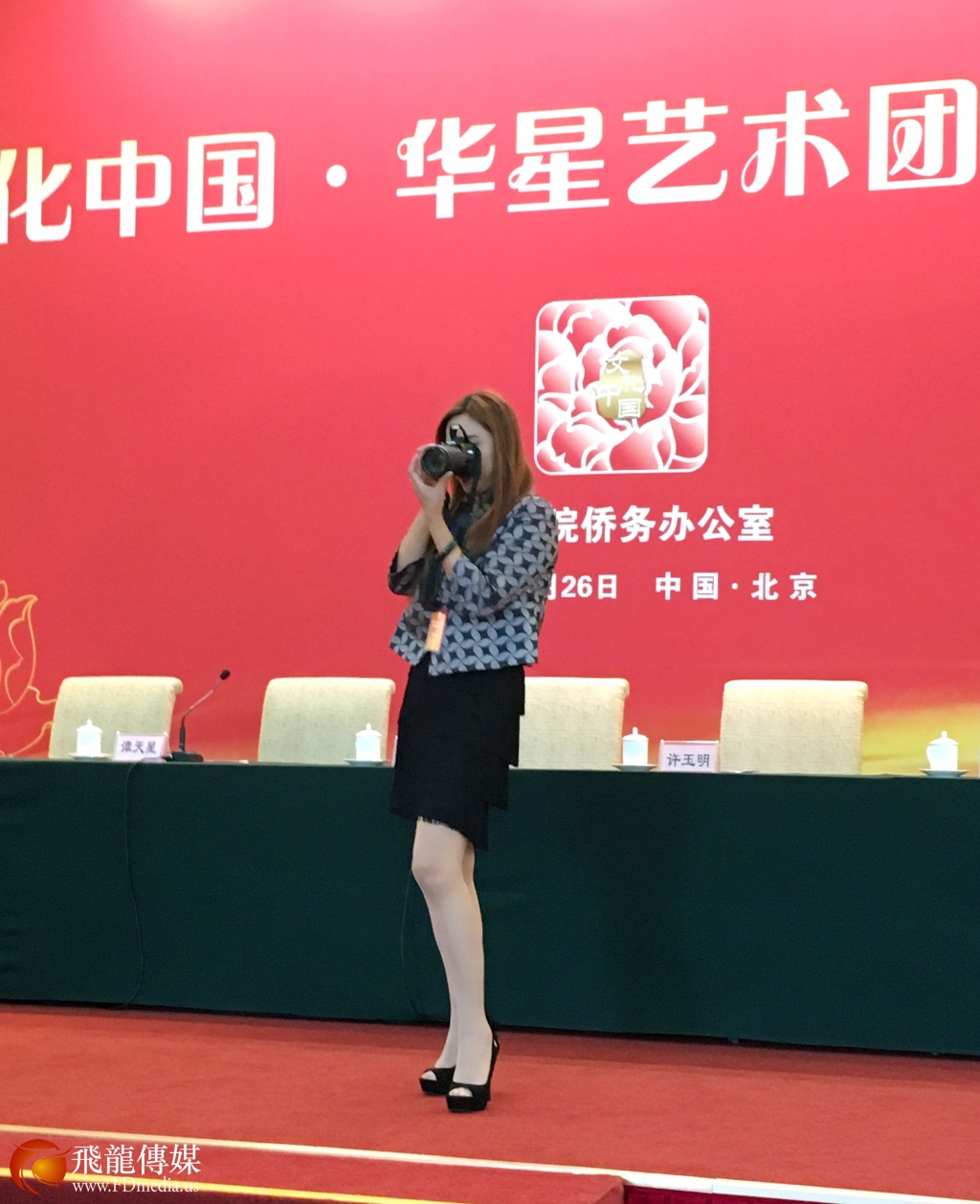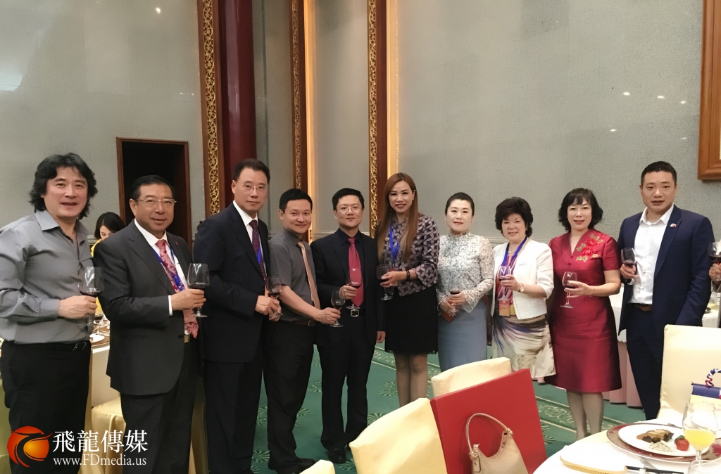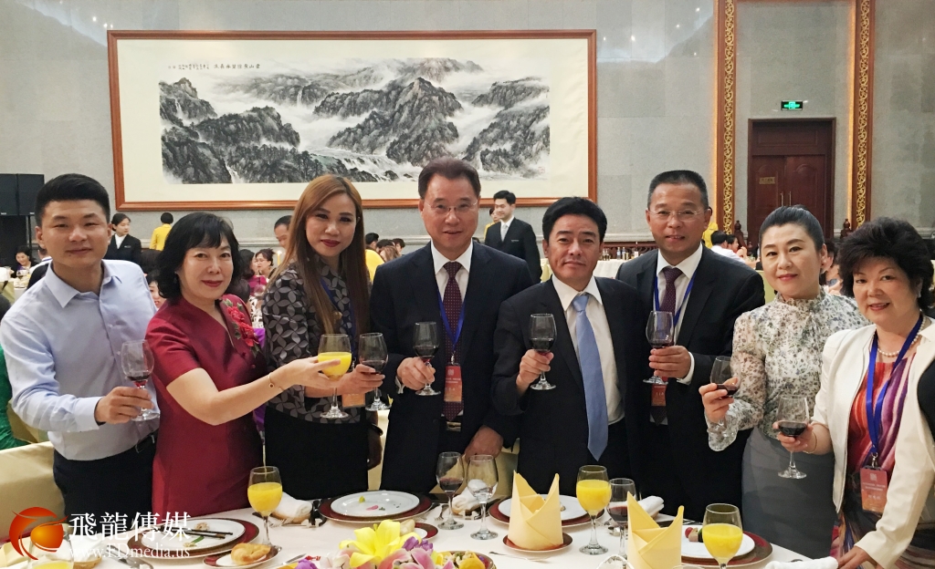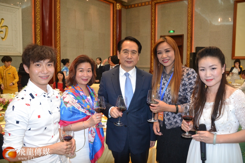 来自美国的四家华星艺术团团长及研修班学员与国侨办宣传司司长许玉明(中)在团长年会开幕式上合影留念。