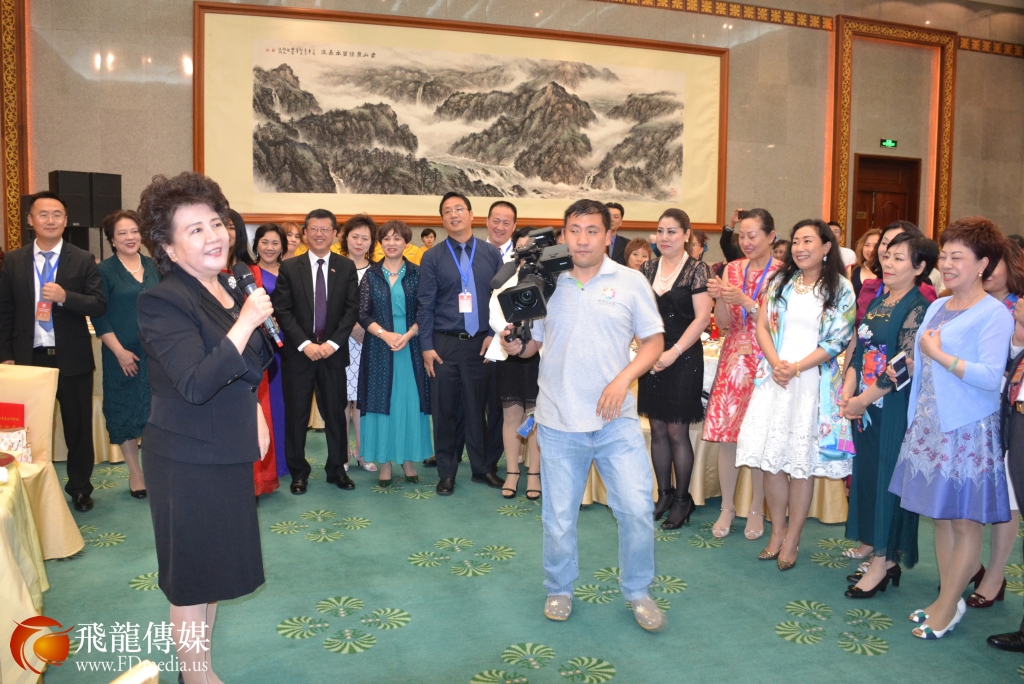 国侨办裘援平主任在钓鱼台国宾馆设宴招待来自24个国家的华星艺术团92名代表,裘援平主任亲自担任指挥,华星艺术团团长及研修班学员们一起歌唱《同一首歌》。